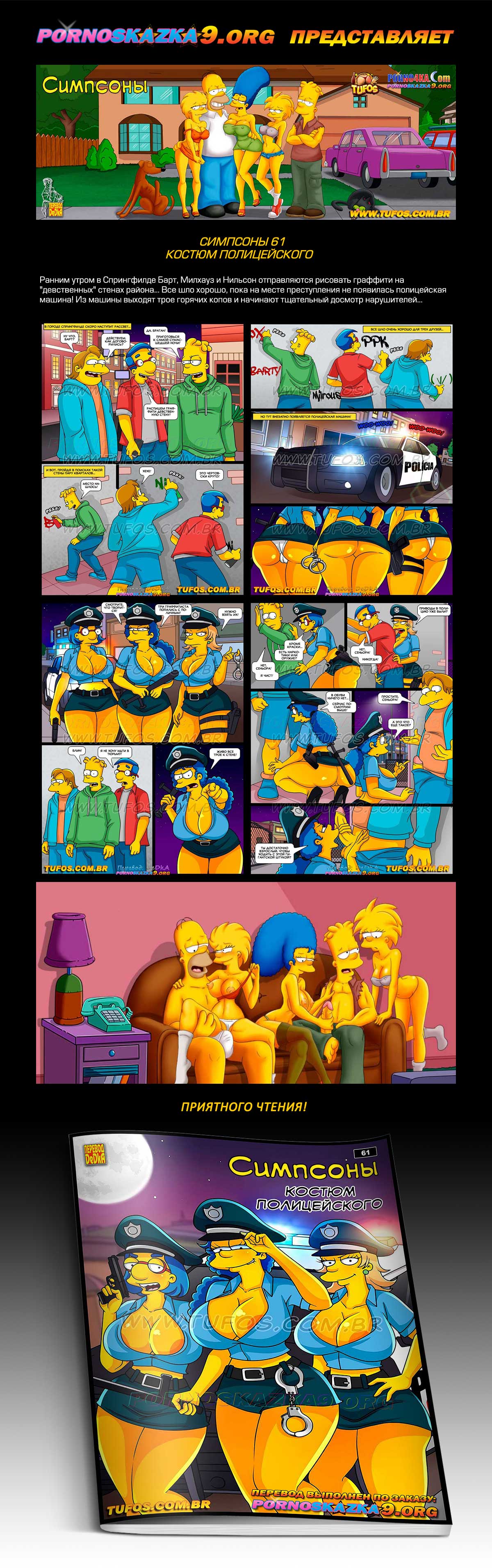 Порно комикс «Симпсоны. Часть 61. Костюм полицейского.» Ранним утром в Спрингфилде Барт, Милхауз и Нильсон отправляются рисовать граффити на «девственных» стенах района… Все шло хорошо, пока на месте преступления не появилась полицейская машина! Из машины выходят трое горячих копов и начинают тщательный досмотр нарушителей…